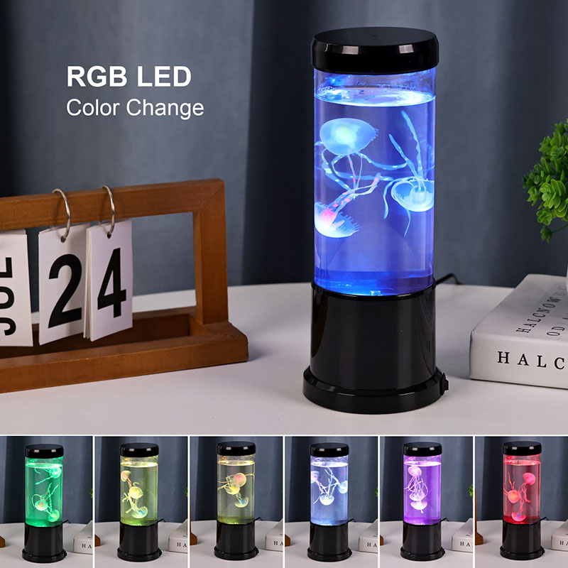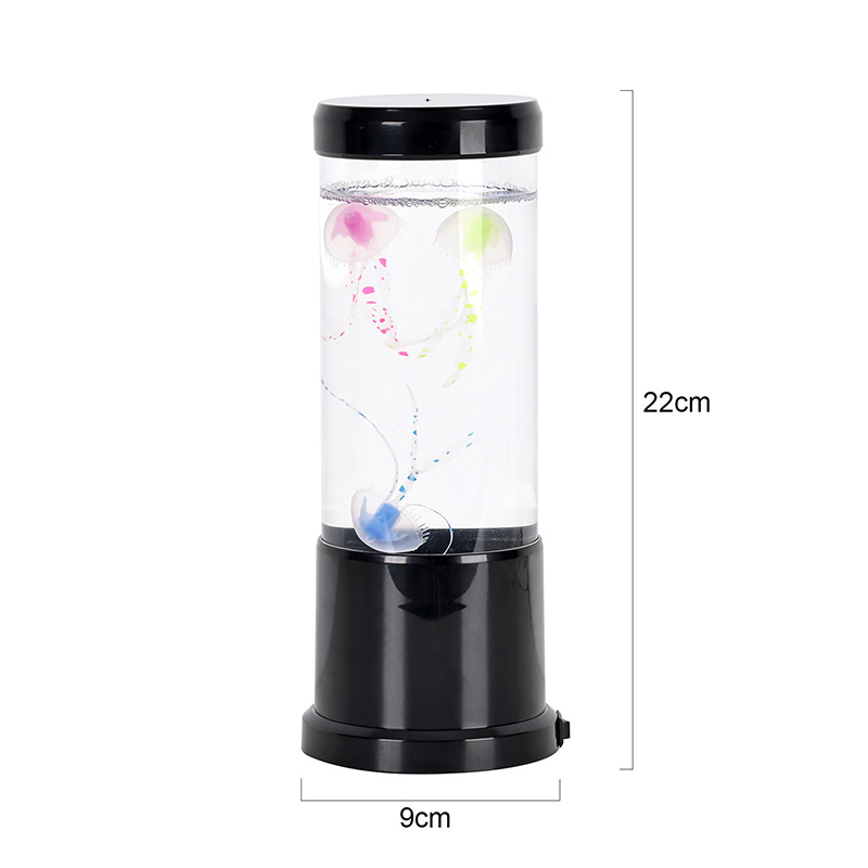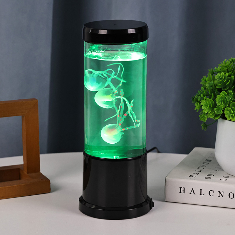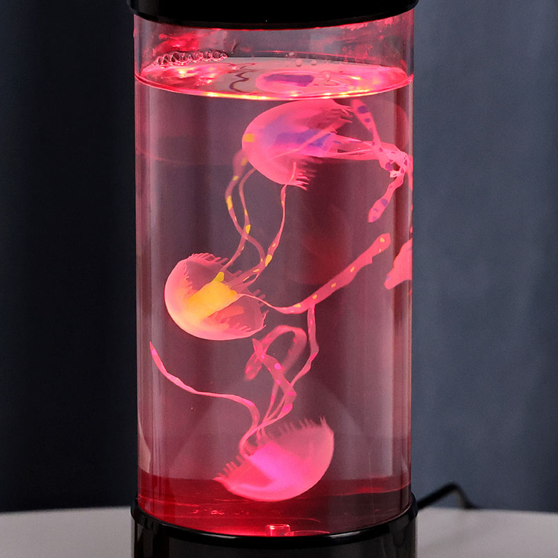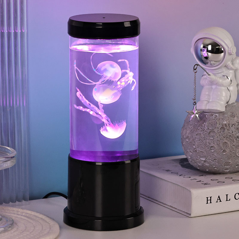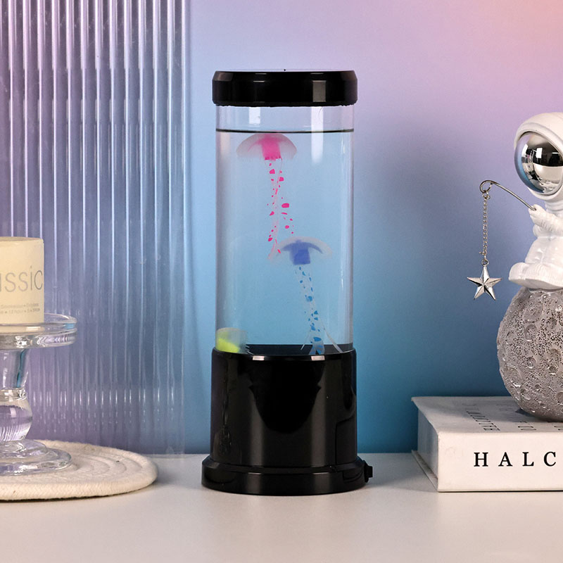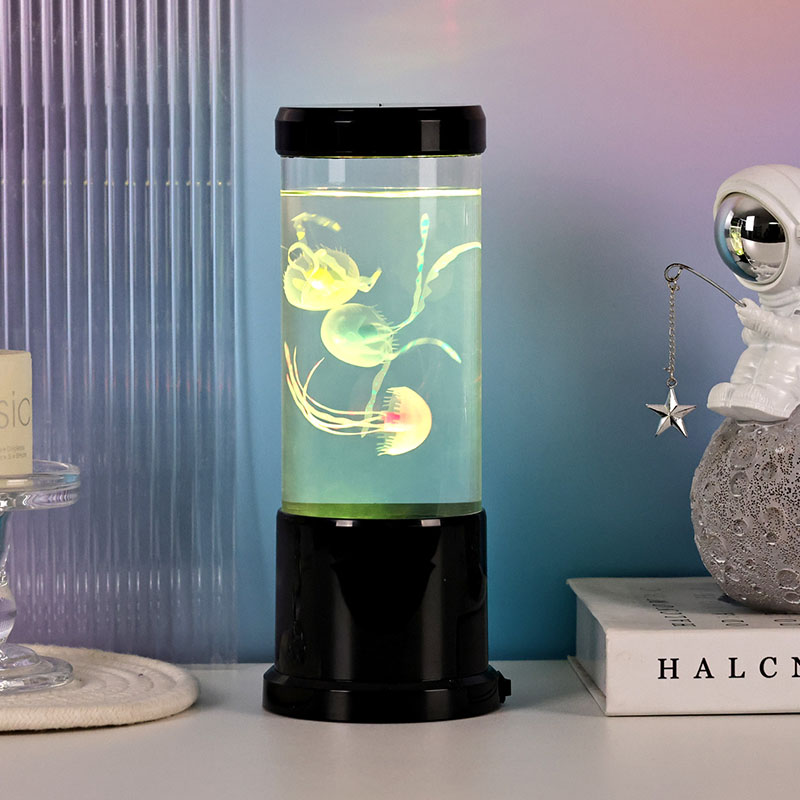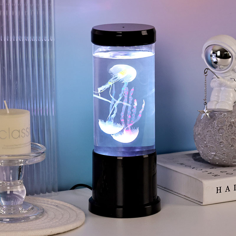 lamp is voorzien van levensechte zwarte schaduwkwallen die zachtjes drijven in een heldere cilindrische tank, waardoor een rustgevende onderwatersfeer ontstaat die elke kamer verandert in een serene oceanische retraite.