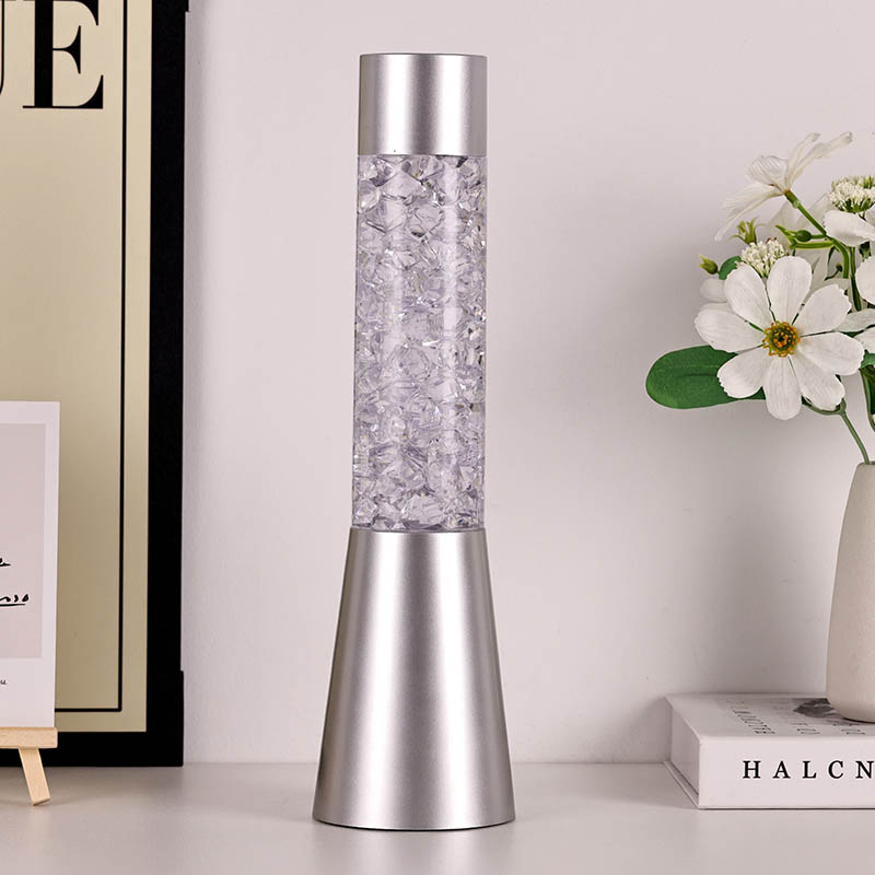 Het kleurveranderende vloeibare glitternachtlampje met ijsachtige vorm heeft een strak en modern ontwerp met een metalen basis en een transparant bovengedeelte gevuld met kleurrijke, kristalachtige stukken. De voet van de lamp is ontworpen om stabiel en elegant te zijn en past bij elke interieurstijl. In het transparante gedeelte bevinden zich de kleurrijke stukken die zachtjes bewegen, waardoor een betoverend visueel effect ontstaat. De lamp is verkrijgbaar in drie verschillende kleurvariaties – rood, blauw en groen – zodat u de perfecte tint kunt kiezen die bij uw interieur past.