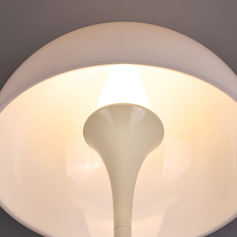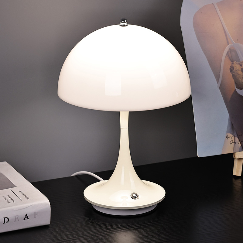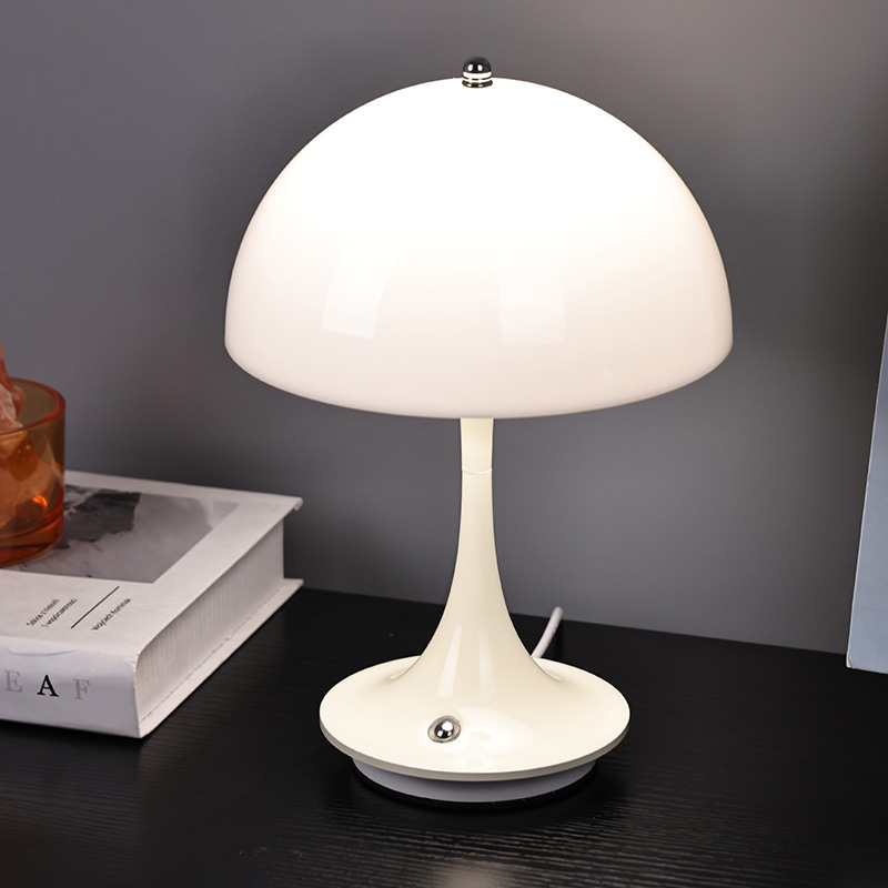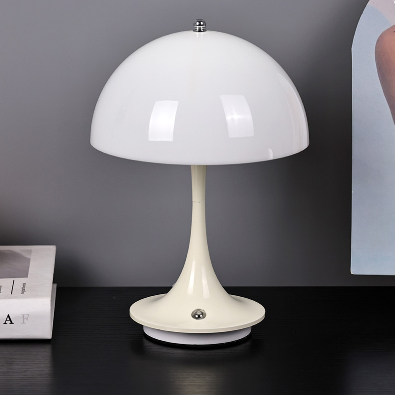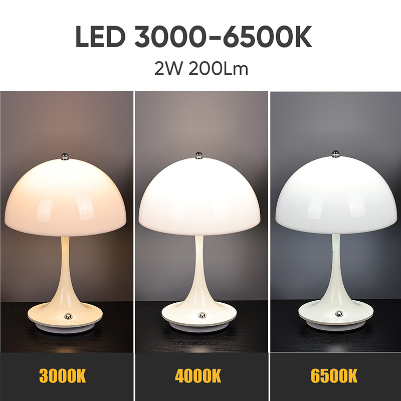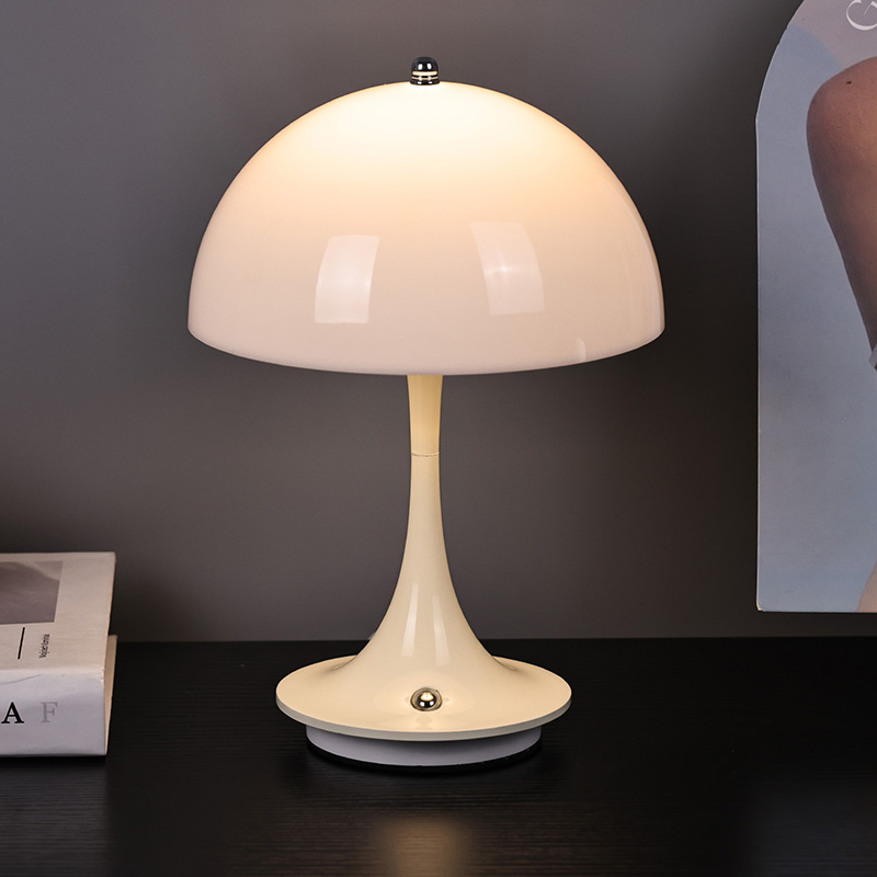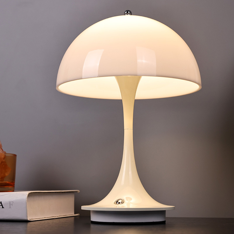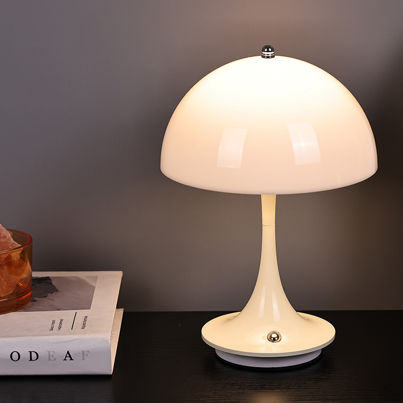 Leuke Led-huislampen met Paddestoelkap hebben een metalen voet en metalen lantaarnpaal, samen met een plastic lampenkap. Het oppervlak van de lampenkap is gewaxt en glad, voelt zeer goed aan en lijkt op een paddestoel
