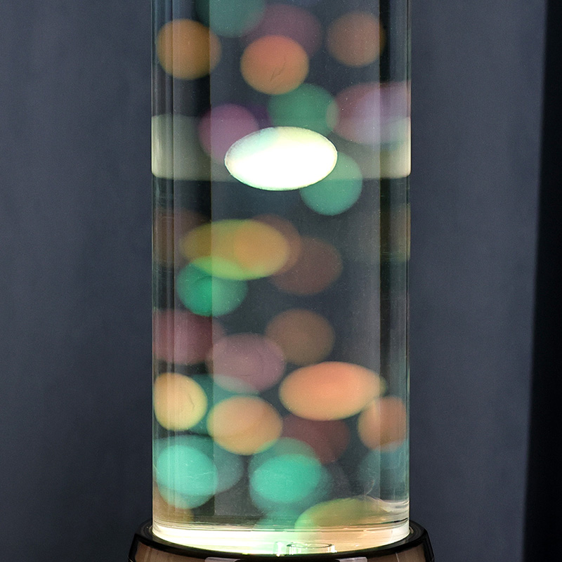 De hoge, elegante cilindervorm van de lamp geeft hem een moderne, minimalistische uitstraling die past bij verschillende interieurstijlen. Het transparante lichaam maakt volledige zichtbaarheid van de interne elementen mogelijk, inclusief de drijvende kwallen en de glinsterende lichtreflecties. De vloeistof binnenin is speciaal samengesteld om de waterstroom te simuleren, waardoor het realisme van de drijvende beweging wordt vergroot. Terwijl de LED's van kleur veranderen, lijkt het alsof de kwal bruist van leven, wat diepte en beweging aan het tafereel toevoegt.