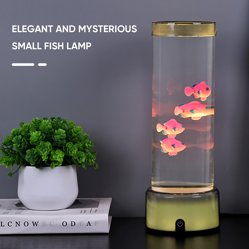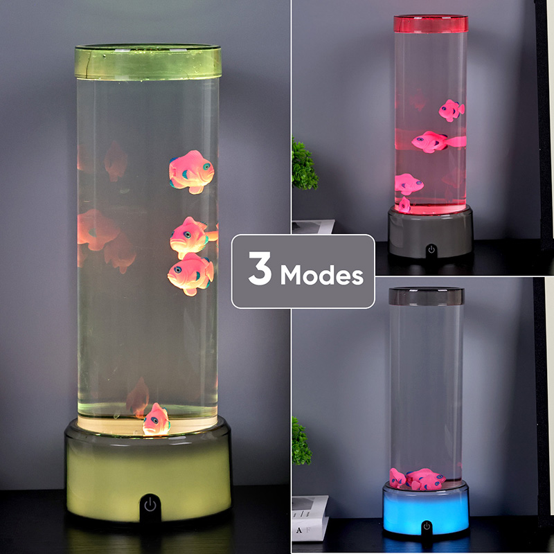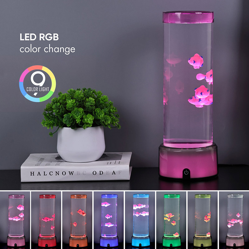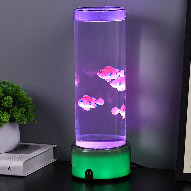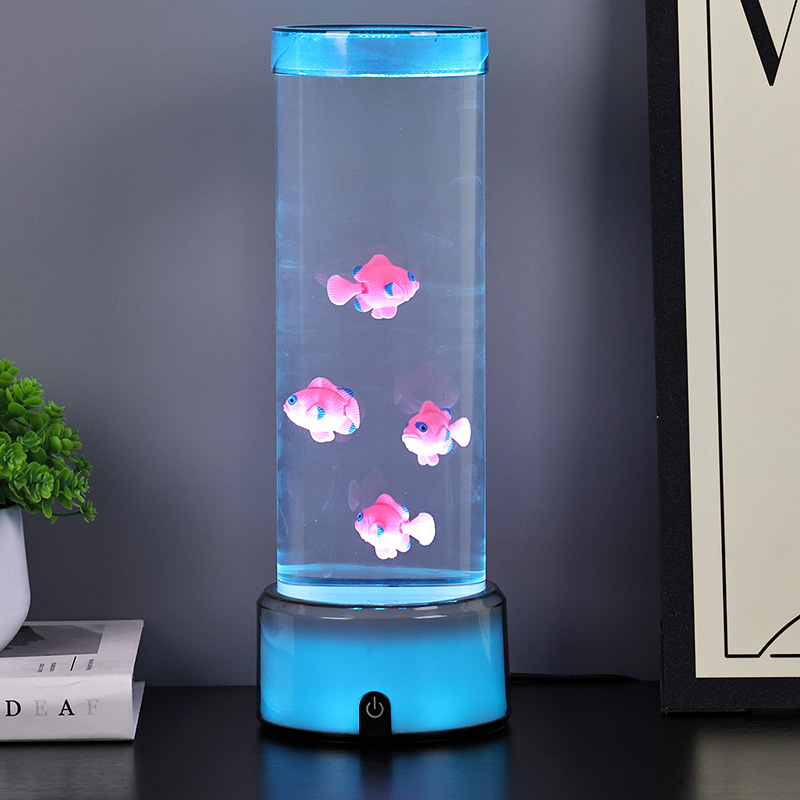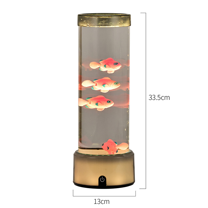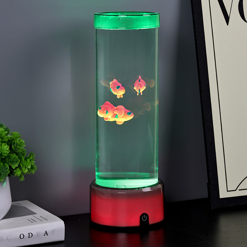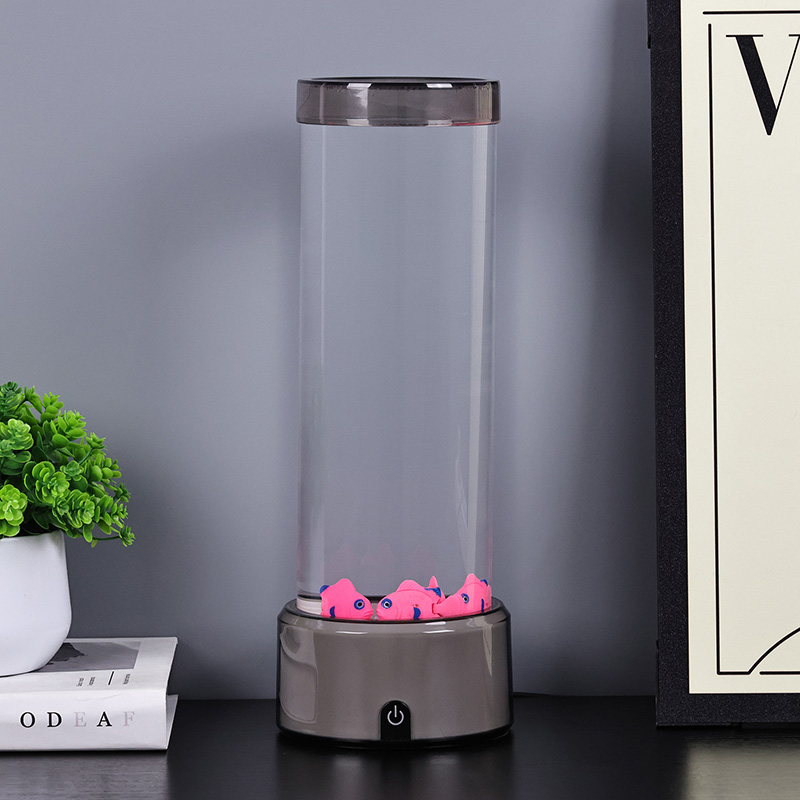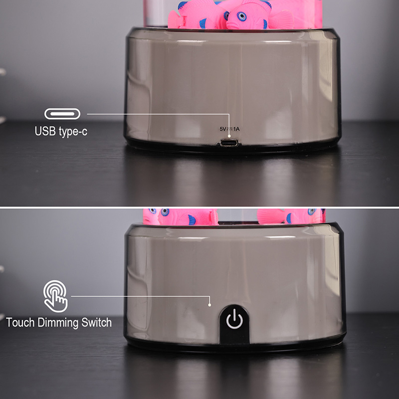 Aanraakkeuzeschakelaar en kwallen zwemmenKwallenvislamp met RGB-basis Decoratieve lamp, een nieuw ontworpen kijkspeelgoed voor kinderen met een cilindrisch ontwerp dat water vasthoudt. Na het vullen met water worden er drie kleine vissen in geplaatst. De Jellyfish Fish Lamp met RGB-basis kan op en neer zwemmen als het kleine motortje aan de onderkant draait. Tegelijkertijd heeft de basis RGB-kleurtransformatie. Het grootste hoogtepunt van dit product is dat de basis ook verandert bij kleurtransformatie. Het volledig plastic ontwerp is zeer licht zonder water vast te houden, wat erg handig is voor transport. De stroombron van de vislamp wordt geleverd door USB type C laagspanning, wat erg handig is