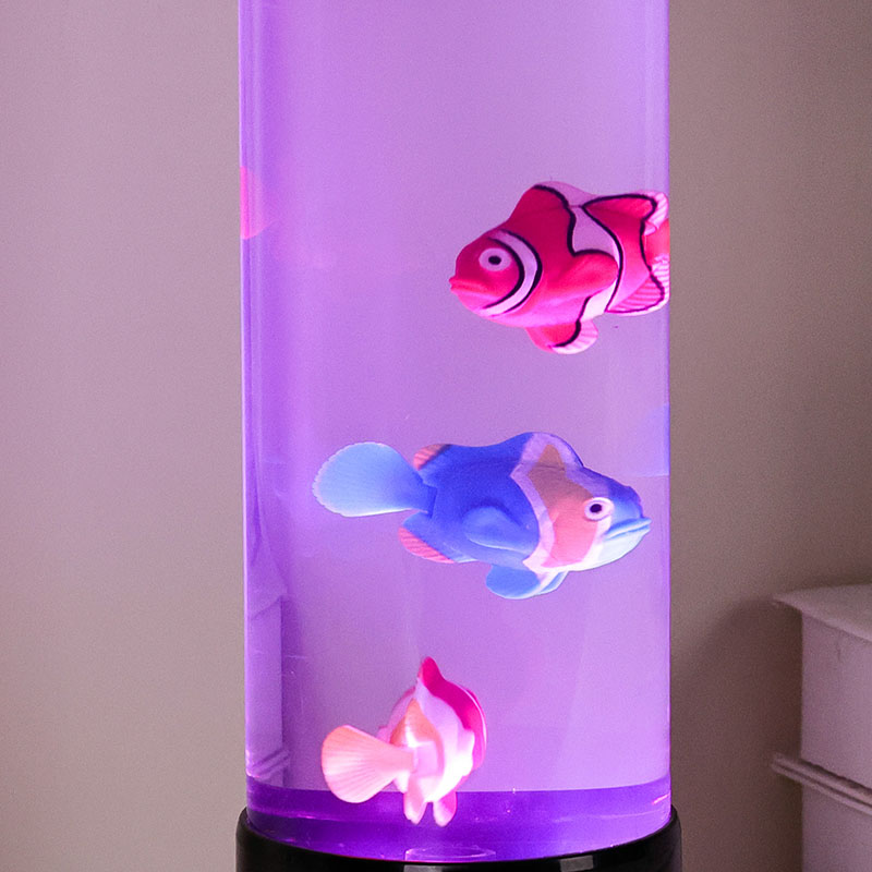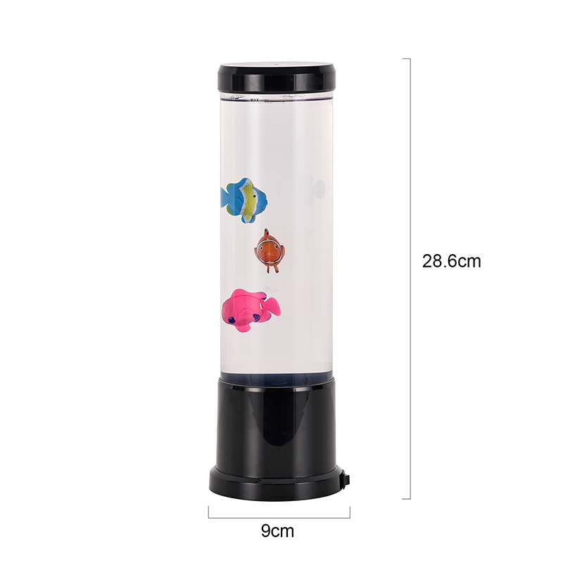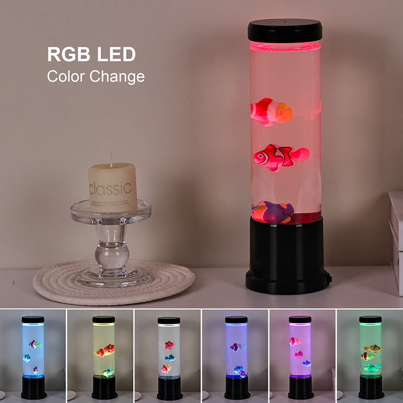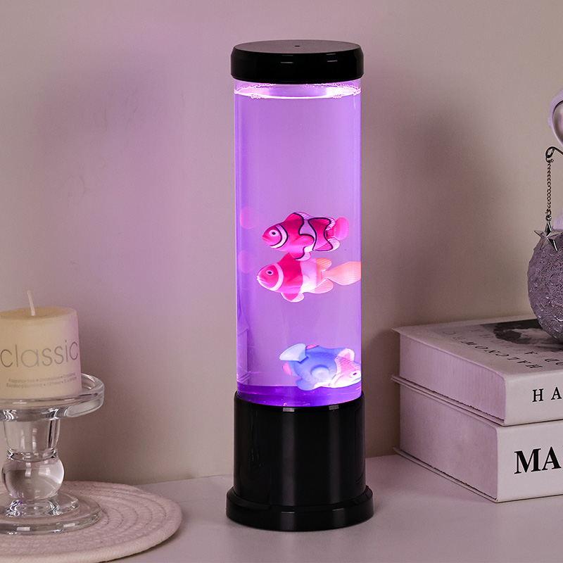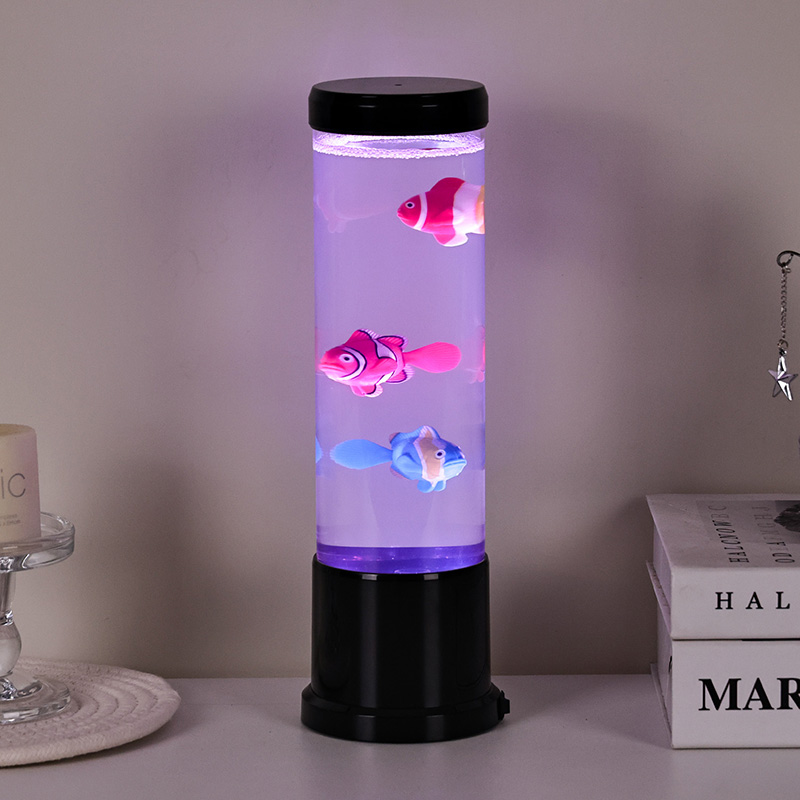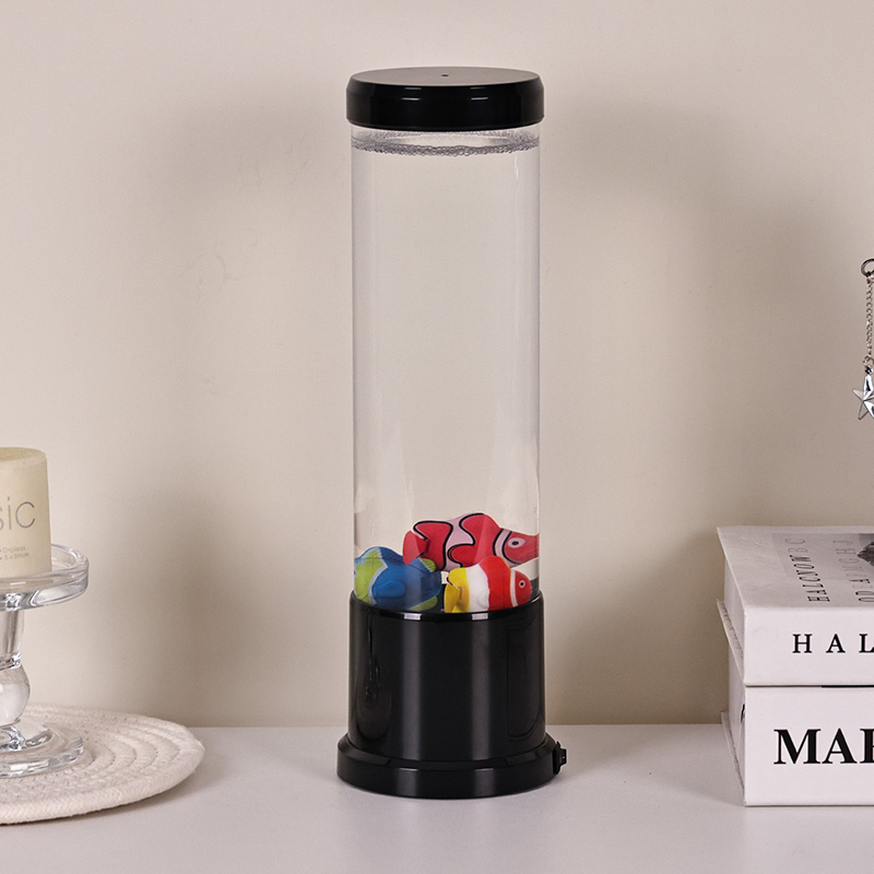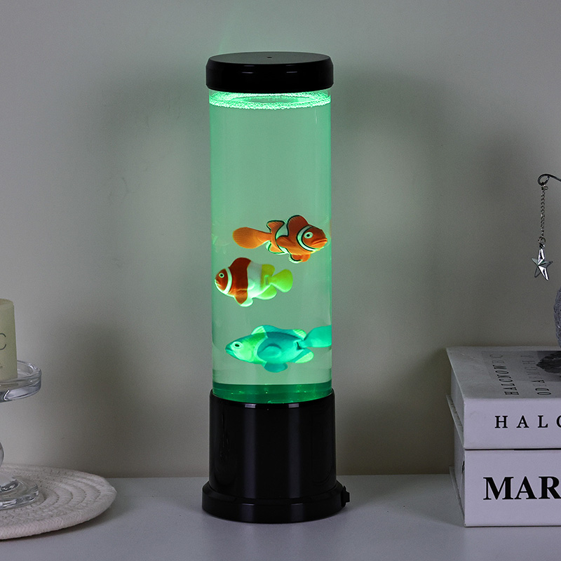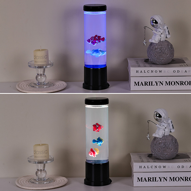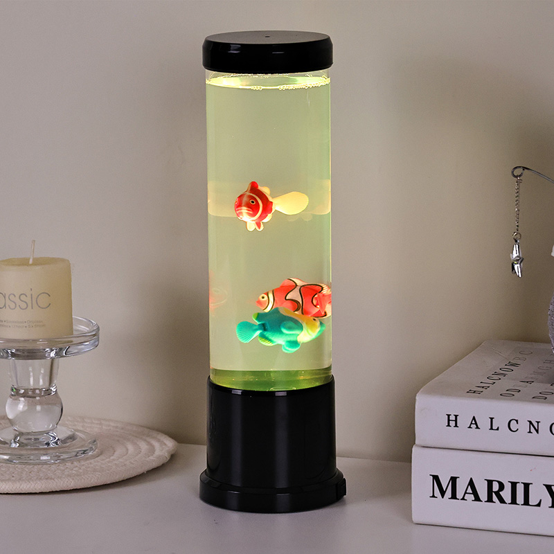De kern van deze lamp is een zorgvuldig vervaardigde simulatie van een echt aquarium. In de doorzichtige kolom vind je prachtig gedetailleerde, drijvende visfiguren, zoals levendige anemoonvissen en andere tropische soorten, die zachtjes door de waterachtige vloeistof bewegen en zwemmen. De toevoeging van gloeiende kwallen versterkt de magische onderwaterillusie, zacht pulserend met etherisch licht. De combinatie van beweging en kleur creëert een dynamisch tafereel dat de aandacht trekt en rust brengt in uw omgeving.