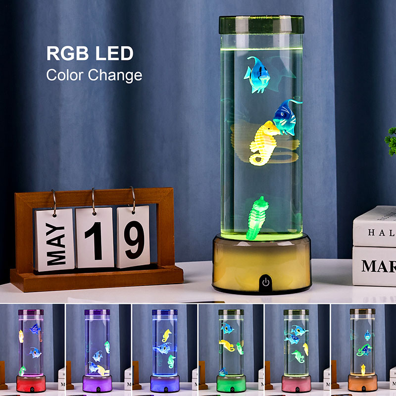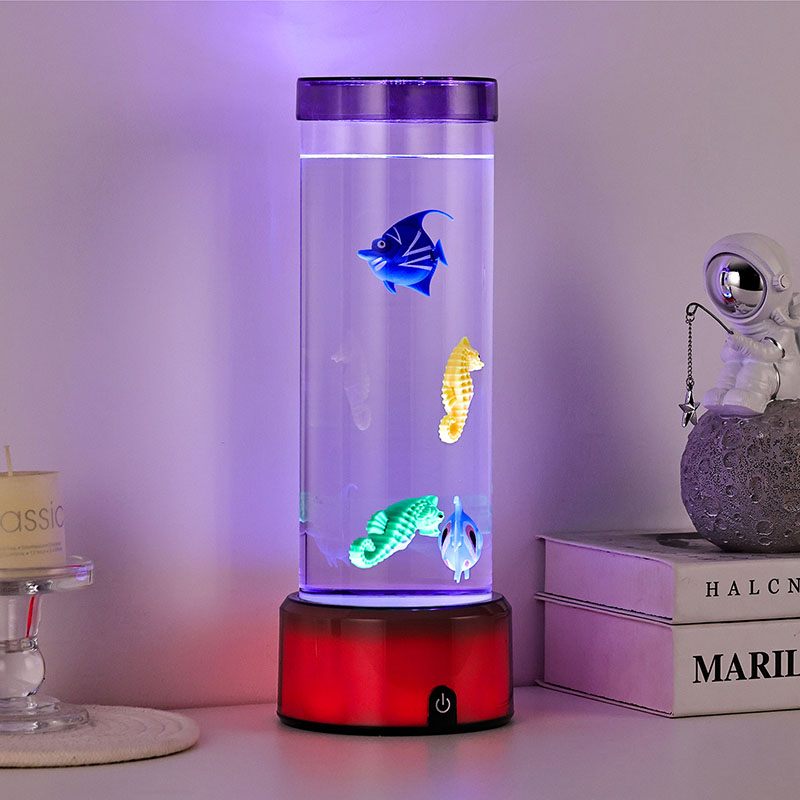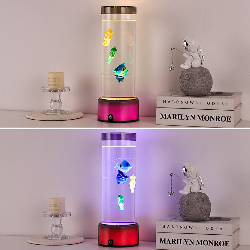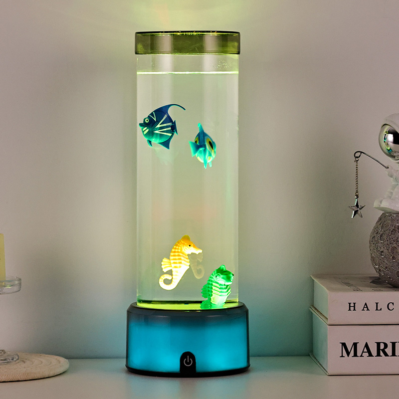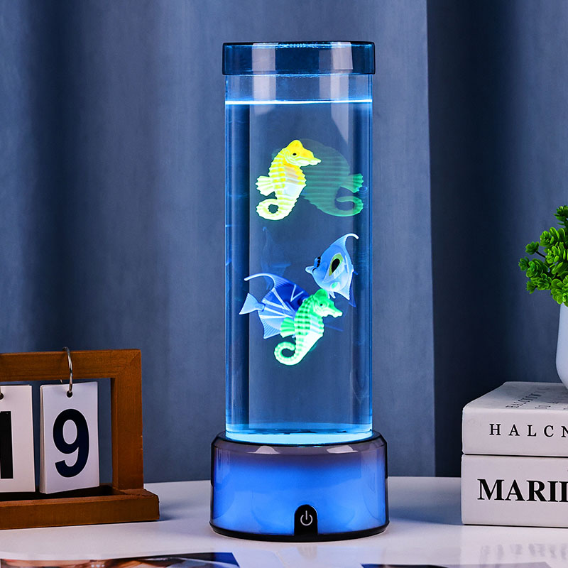 charme. Deze boeiende lamp is gemaakt van hoogwaardig, duurzaam plastic en heeft een slank cilindrisch lichaam gevuld met heldere vloeistof en prachtig gedetailleerde drijvende visfiguren, waaronder levendige tropische vissen en een charmant zeepaardje, waardoor een sereen, levensecht oceaantafereel ontstaat dat rust en visueel genot brengt in elke kamer.