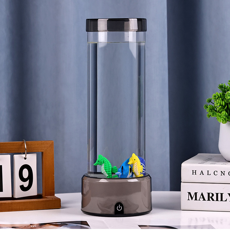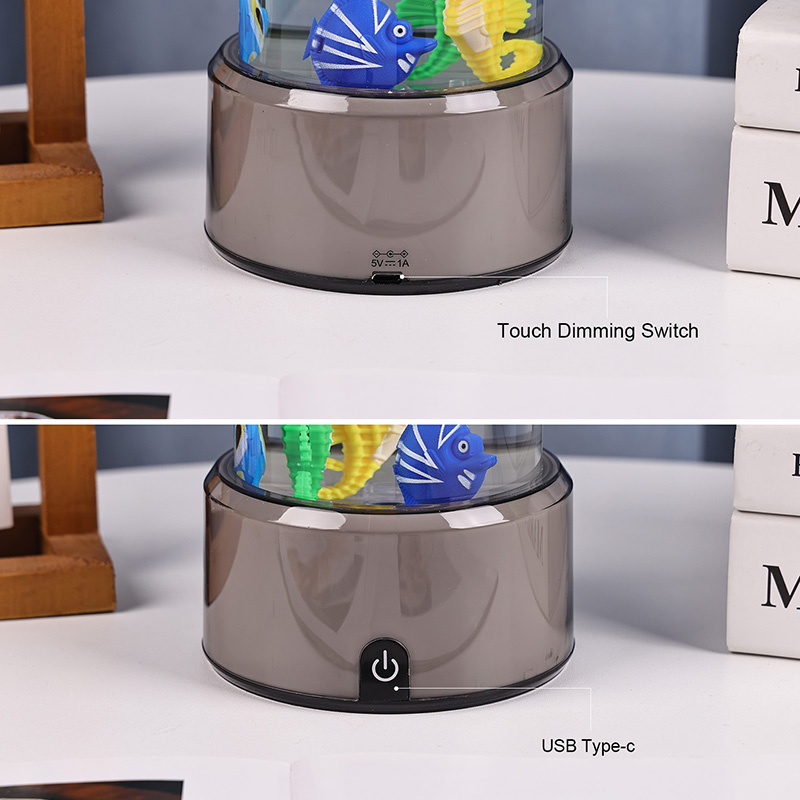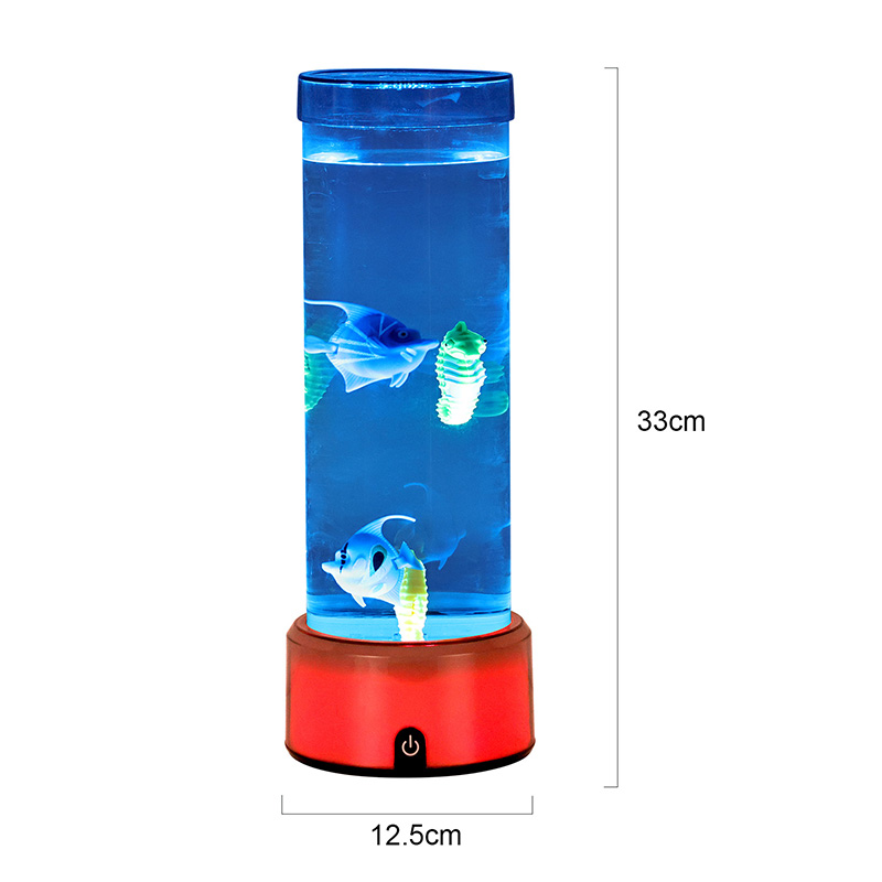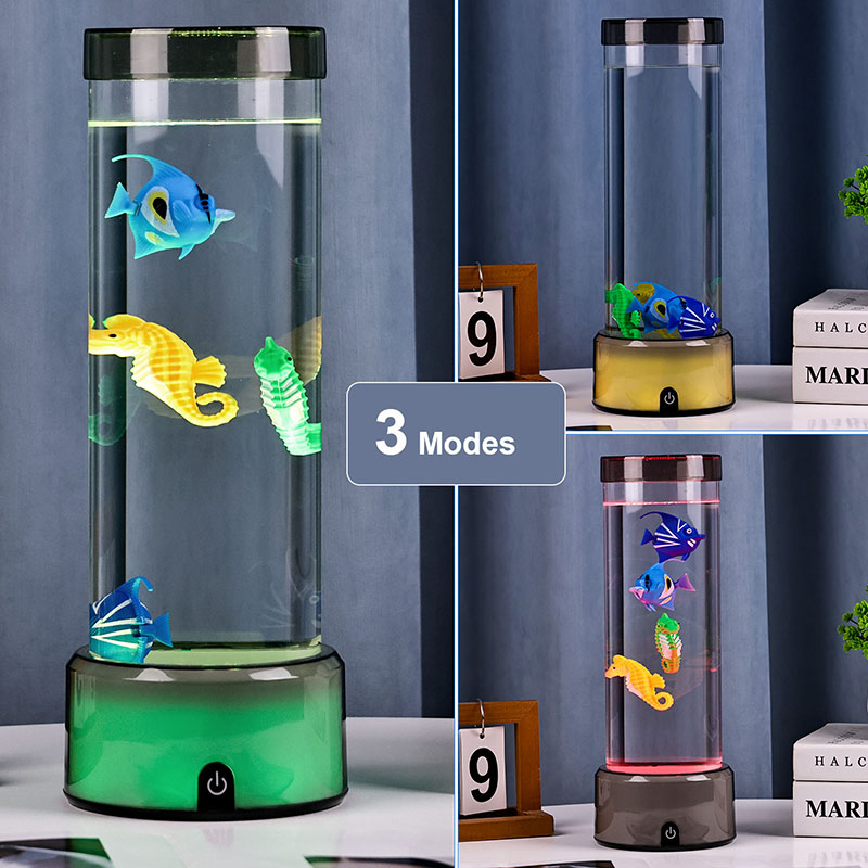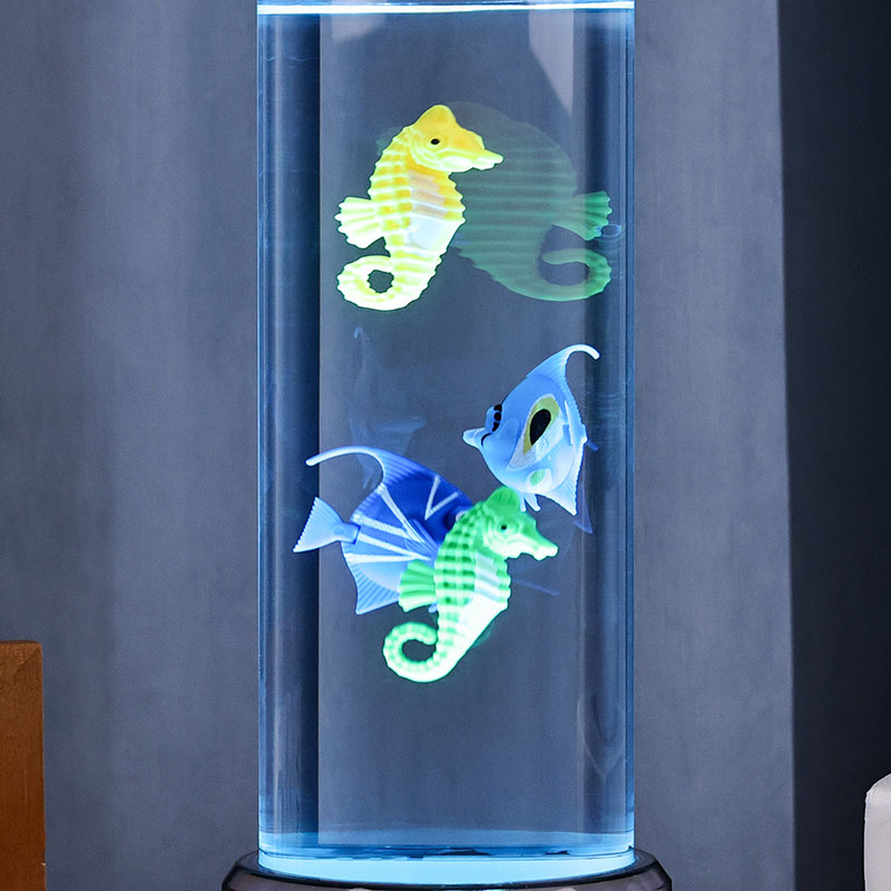 charme. Deze boeiende lamp is gemaakt van hoogwaardig, duurzaam plastic en heeft een slank cilindrisch lichaam gevuld met heldere vloeistof en prachtig gedetailleerde drijvende visfiguren, waaronder levendige tropische vissen en een charmant zeepaardje, waardoor een sereen, levensecht oceaantafereel ontstaat dat rust en visueel genot brengt in elke kamer.
