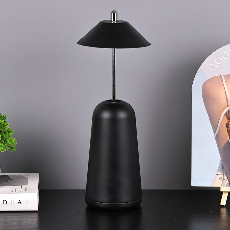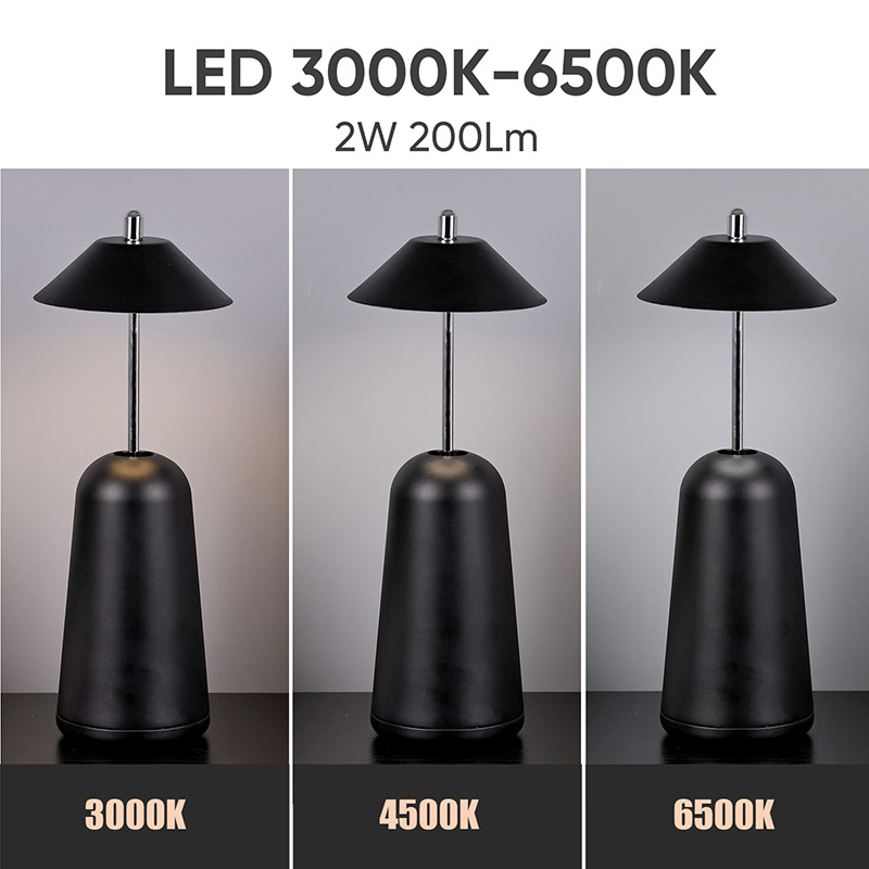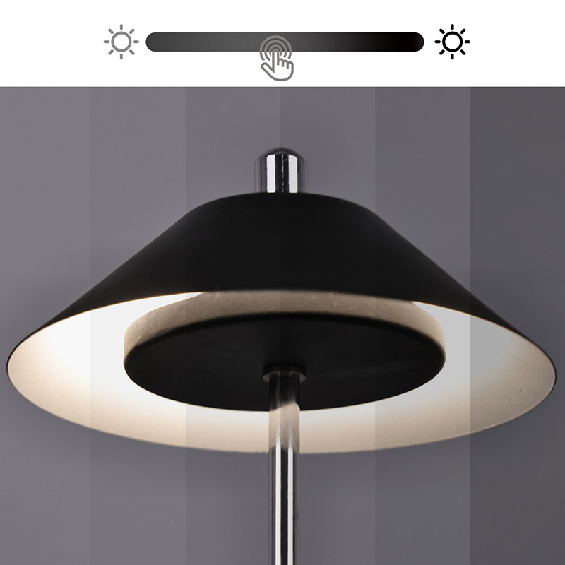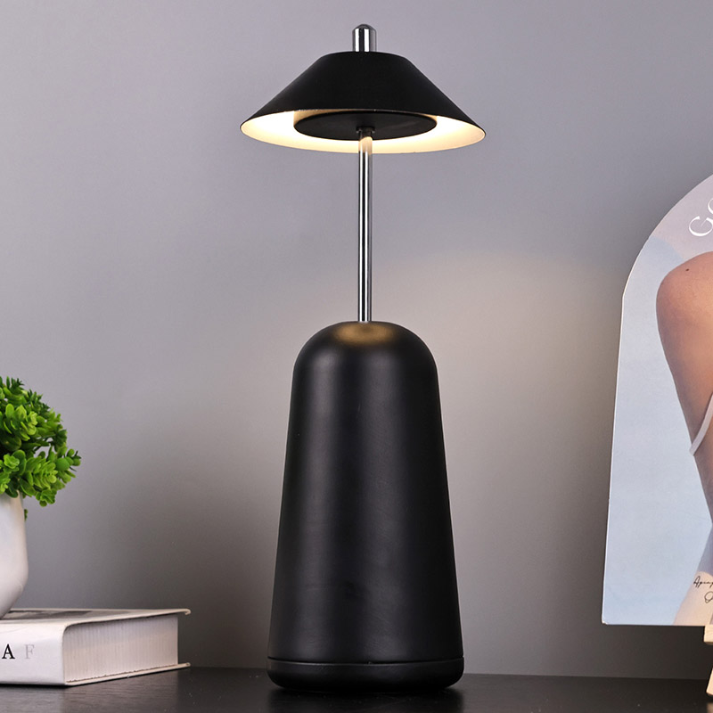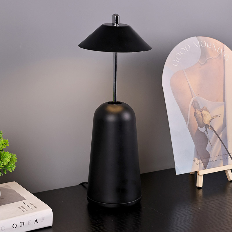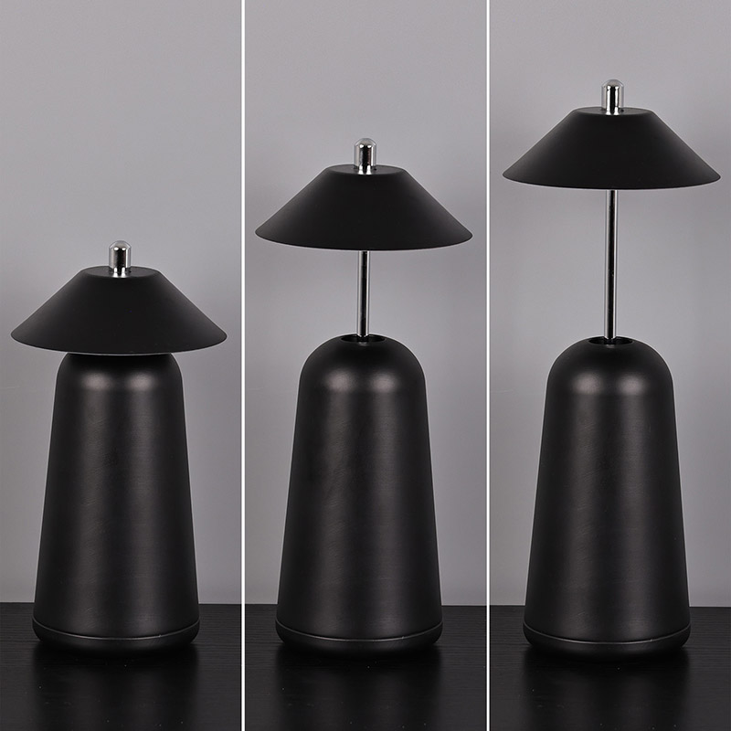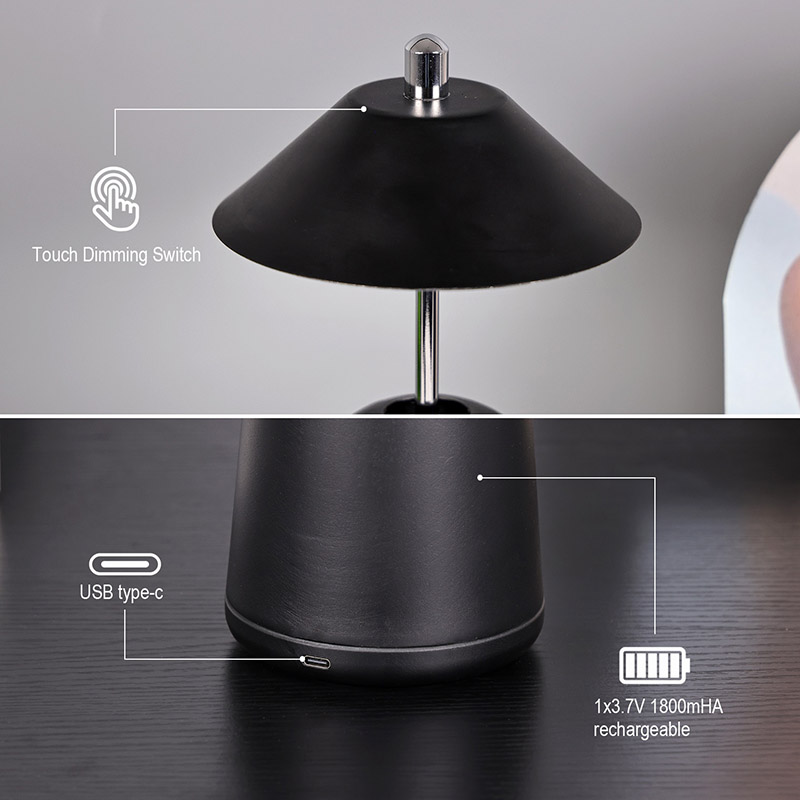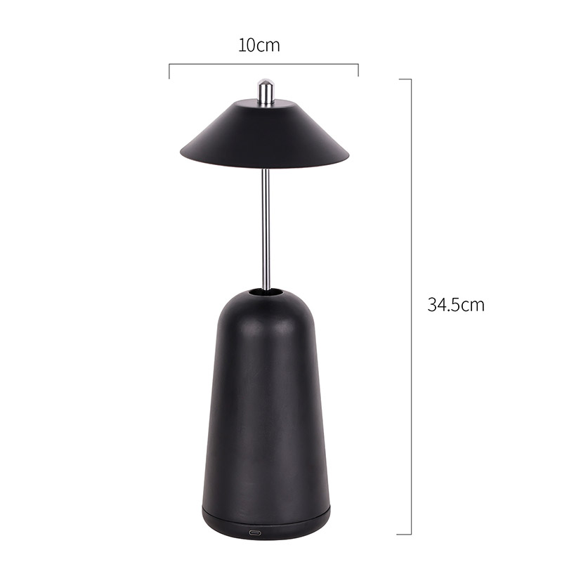 Het licht van de moderne led-bureaulamp met verstelbare hoogte wordt intern in de lampenkap gesneden, met warme kleuren en drie niveaus van lichtintensiteit, variërend van 3000K tot 6500K. De bovenkant van de lampenkap is een aanraakschakelaar, vergelijkbaar met een antenne. De basis bestaat uit onregelmatig cilindrisch metaal