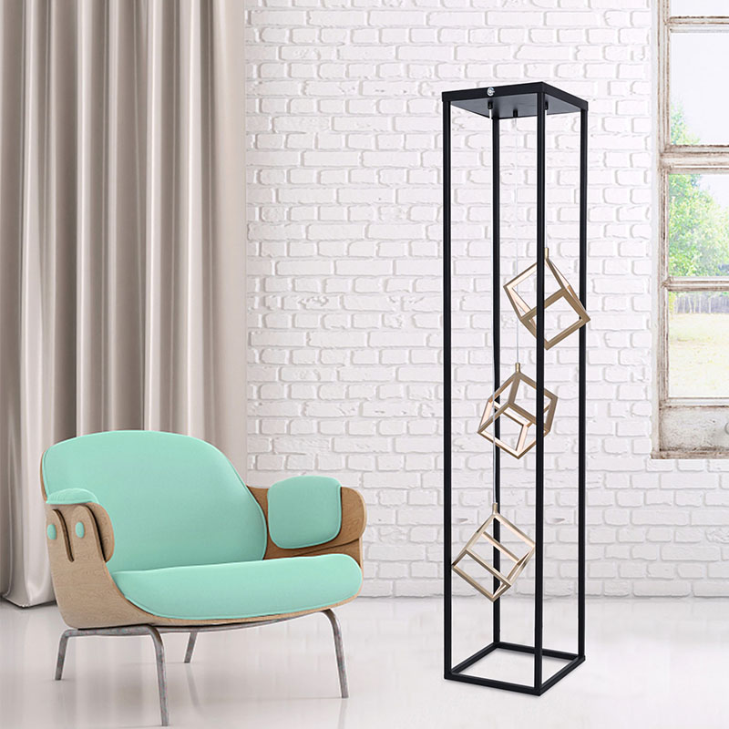 Modern ontworpen vloerlampen, het grootste kenmerk van het product is de rechthoekige framevorm van metaal, met 3 vierkante LED-kroonluchters erin. Het totale ontwerp kan als decoratie in de hal worden gebruikt en aan de bovenkant zit een knop om de intensiteit van het licht te regelen