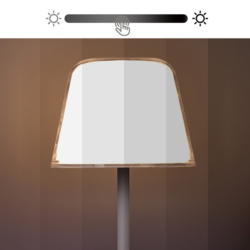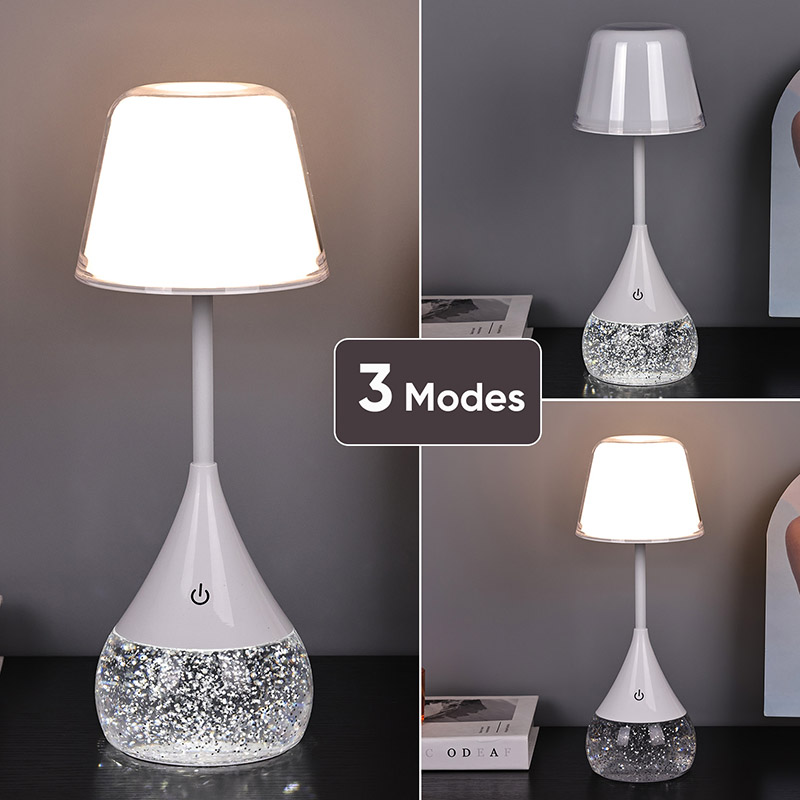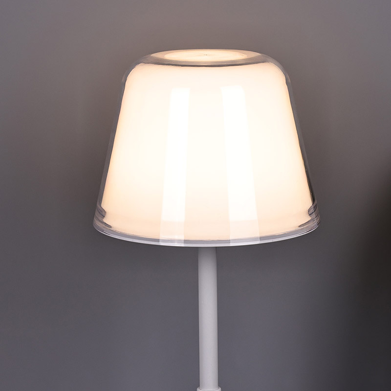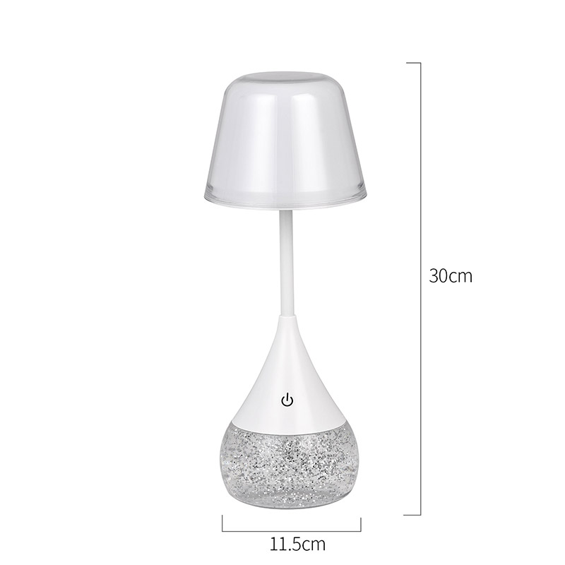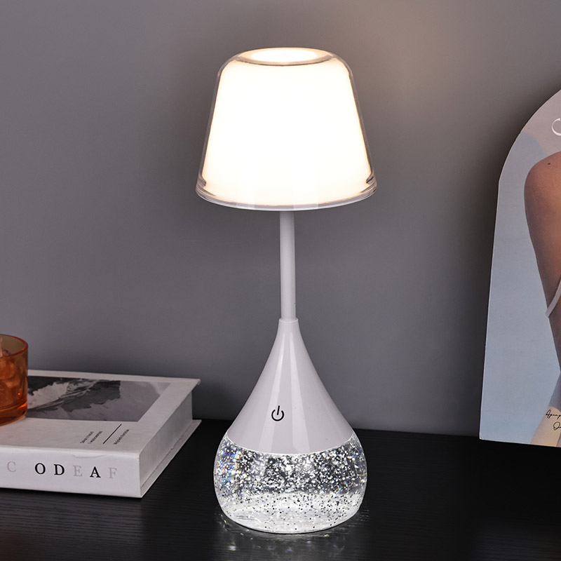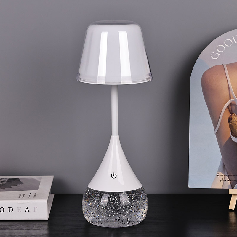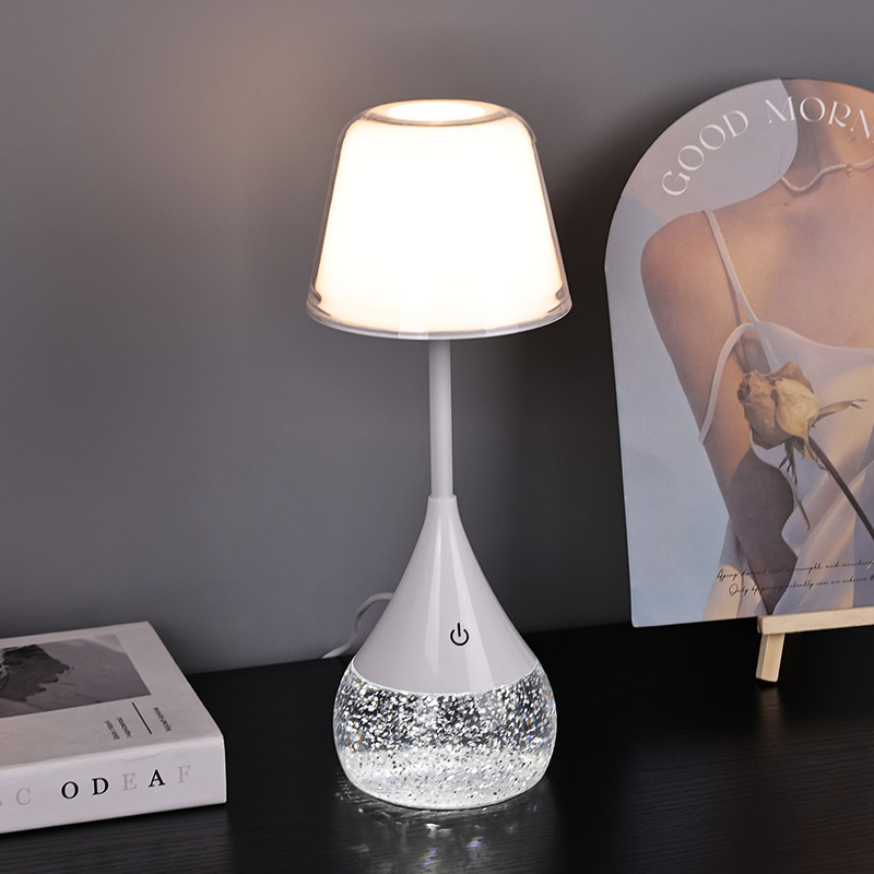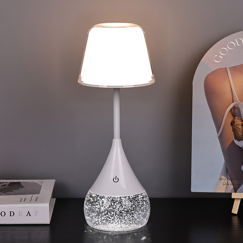 Deak-lamp met glad kunststof oppervlak heeft een 5v1a-stroomingang om licht aan de achterkant te bewijzen, en in het oppervlak is een aanraakbediening aanwezig.