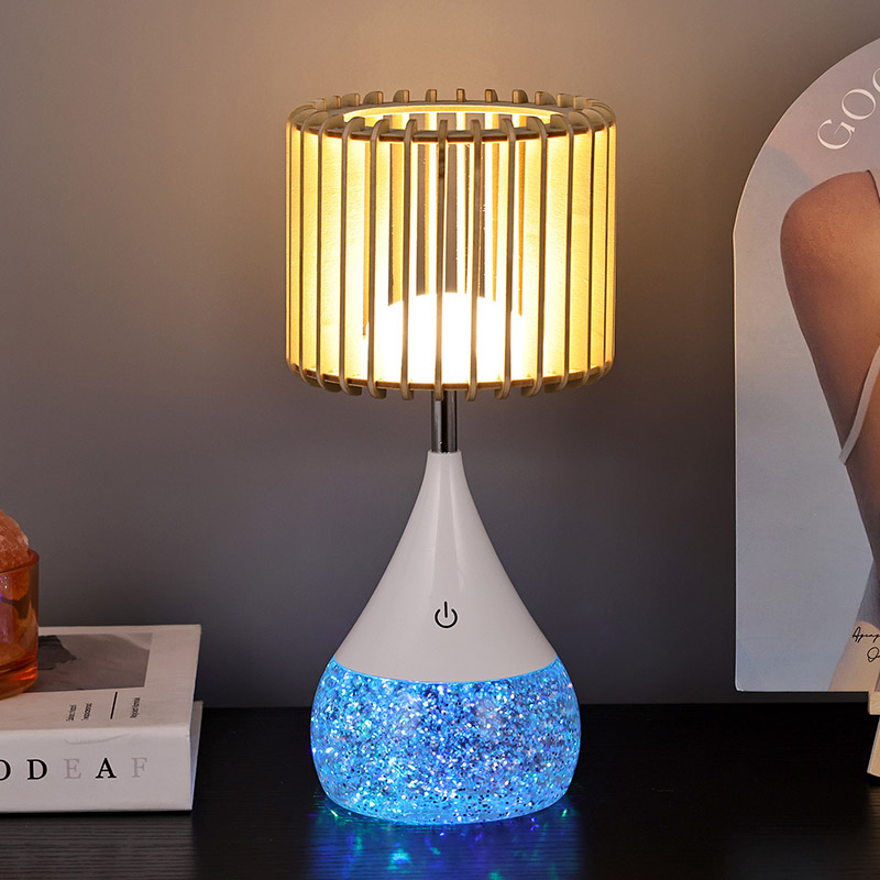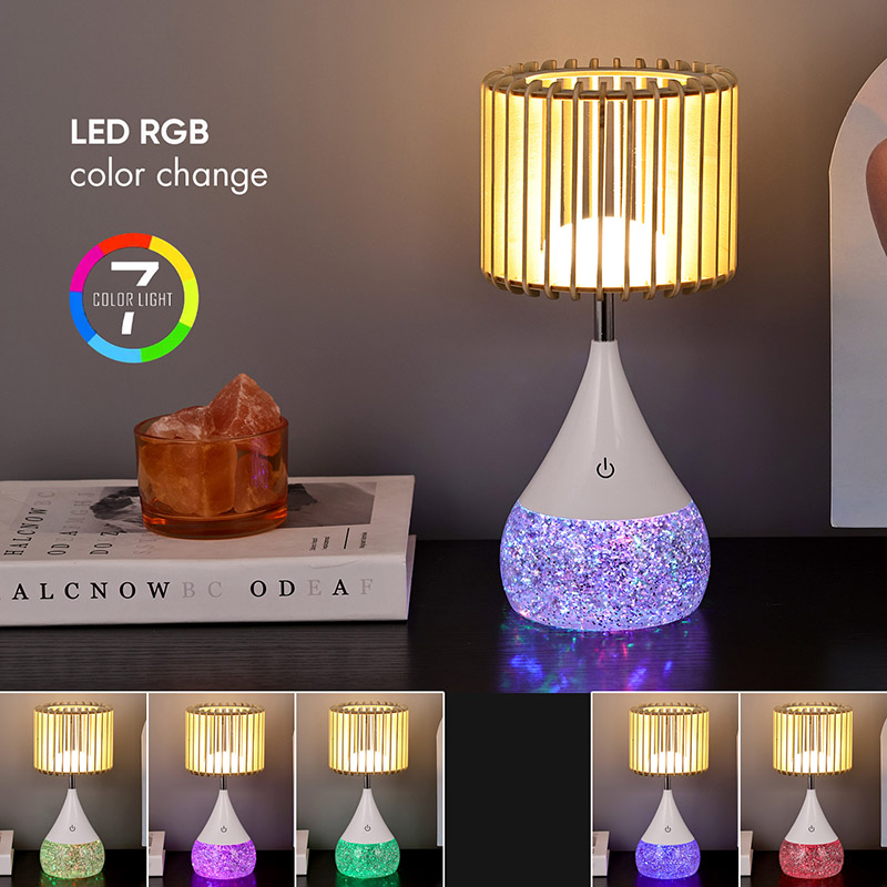 Ontwerp:** Unieke lampenkap met houten latten, RGB-kleurveranderende voet