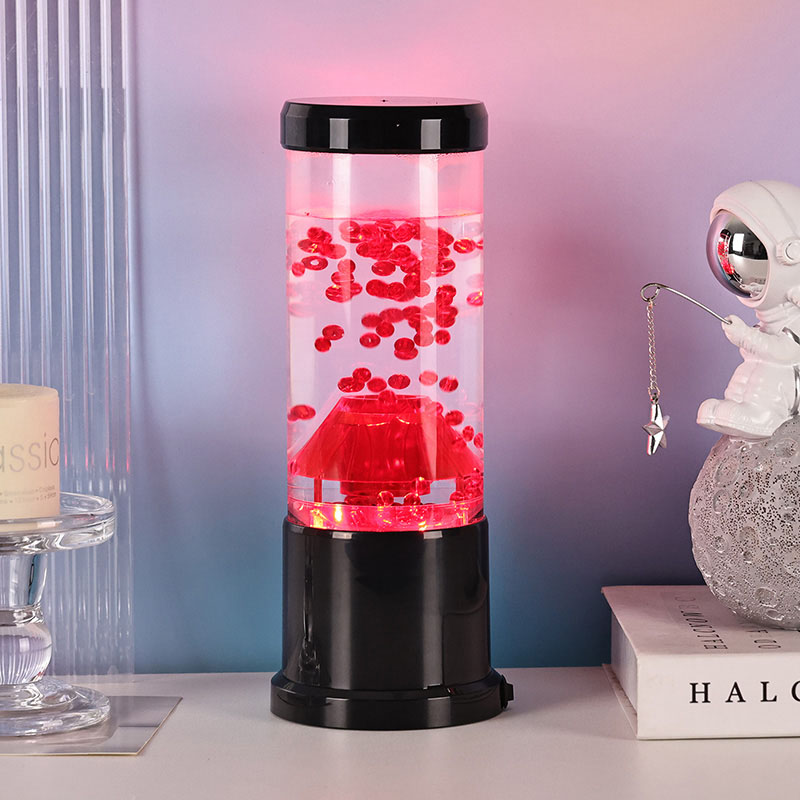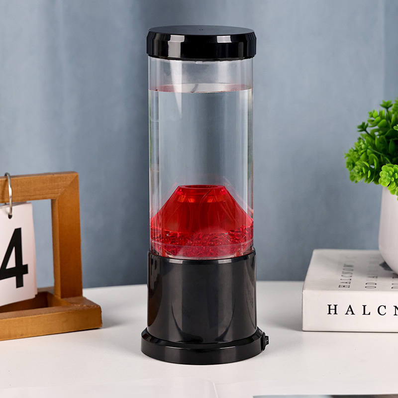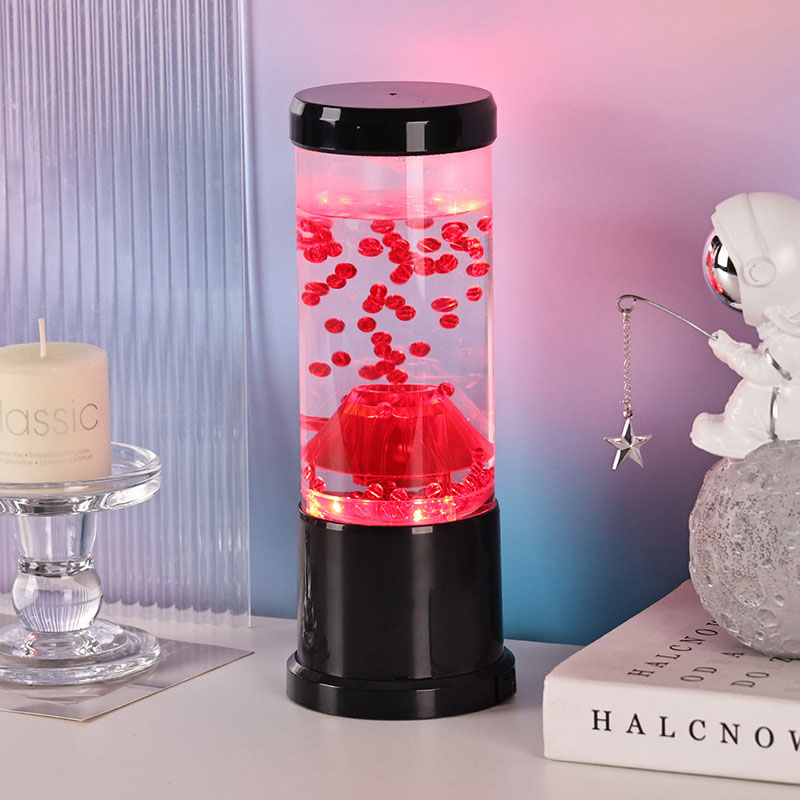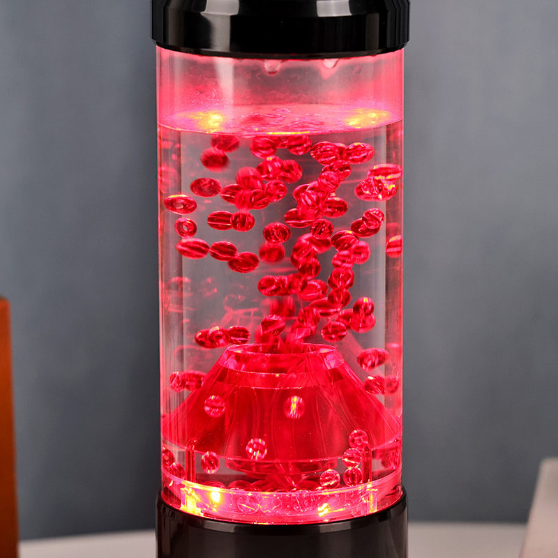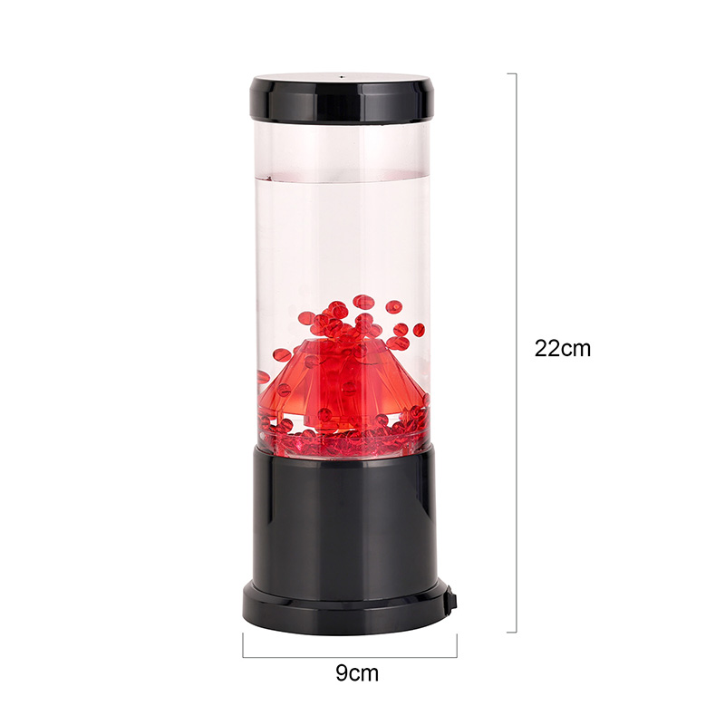 Het centrale stuk van het nachtlampje is een transparante kolom die lijkt op een vulkanische krater. In deze kolom vind je een levendige weergave van rode bollen, die doen denken aan gesmolten lava die in de aardkorst stroomt. Deze bollen zweven sierlijk in een heldere vloeistof, waardoor een dynamisch en steeds veranderend visueel effect ontstaat. Terwijl het licht er doorheen schijnt, straalt het een warme en uitnodigende gloed uit, perfect om in elke kamer een gezellige sfeer te creëren.