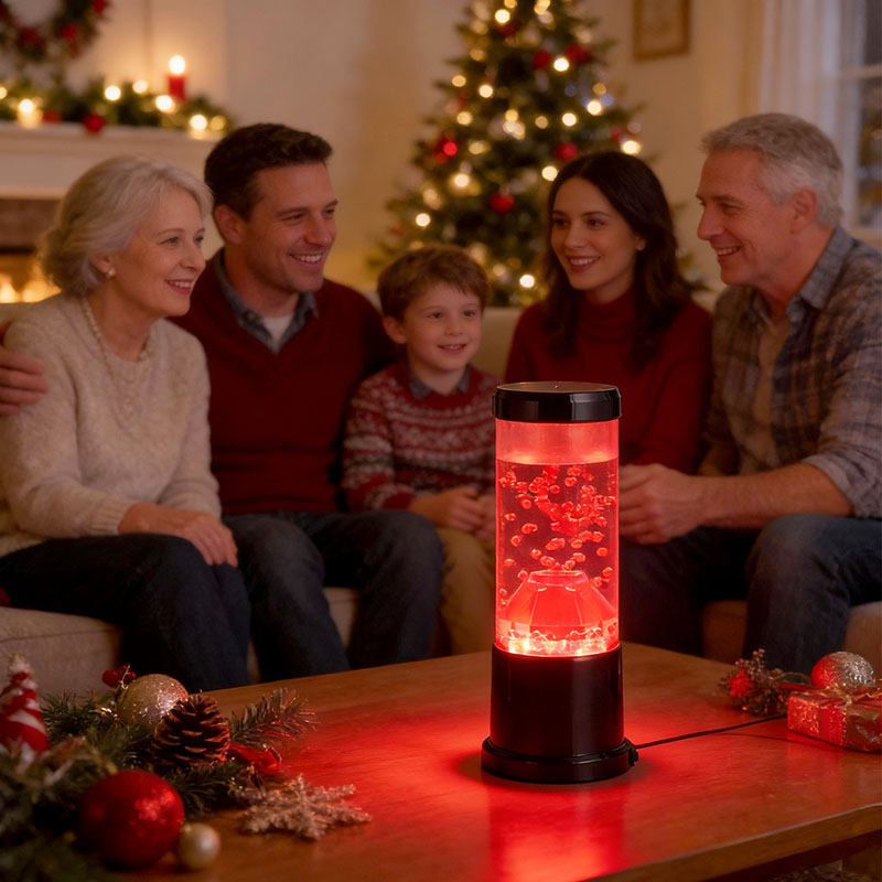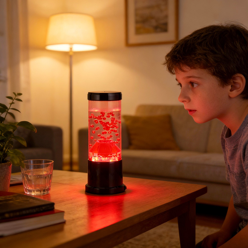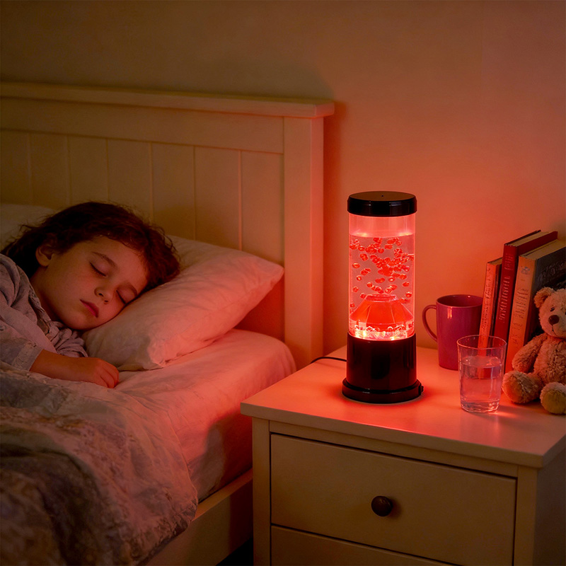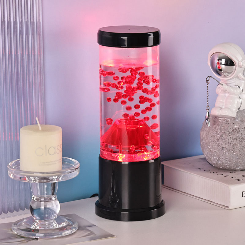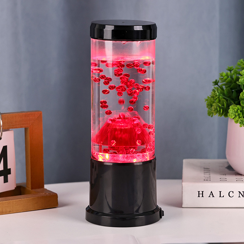 Het centrale stuk van het nachtlampje is een transparante kolom die lijkt op een vulkanische krater. In deze kolom vind je een levendige weergave van rode bollen, die doen denken aan gesmolten lava die in de aardkorst stroomt. Deze bollen zweven sierlijk in een heldere vloeistof, waardoor een dynamisch en steeds veranderend visueel effect ontstaat. Terwijl het licht er doorheen schijnt, straalt het een warme en uitnodigende gloed uit, perfect om in elke kamer een gezellige sfeer te creëren.